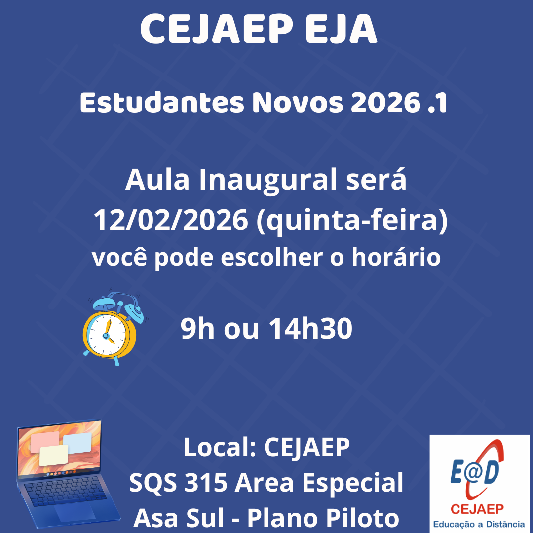 Aqui, você terá acesso à modalidade de ensino da Educação de Jovens e Adultos e da Educação Profissional. Estas ofertas são realizadas pelo CEJAEP que é vinculado à Secretaria de Estado de Educação do Distrito Federal.