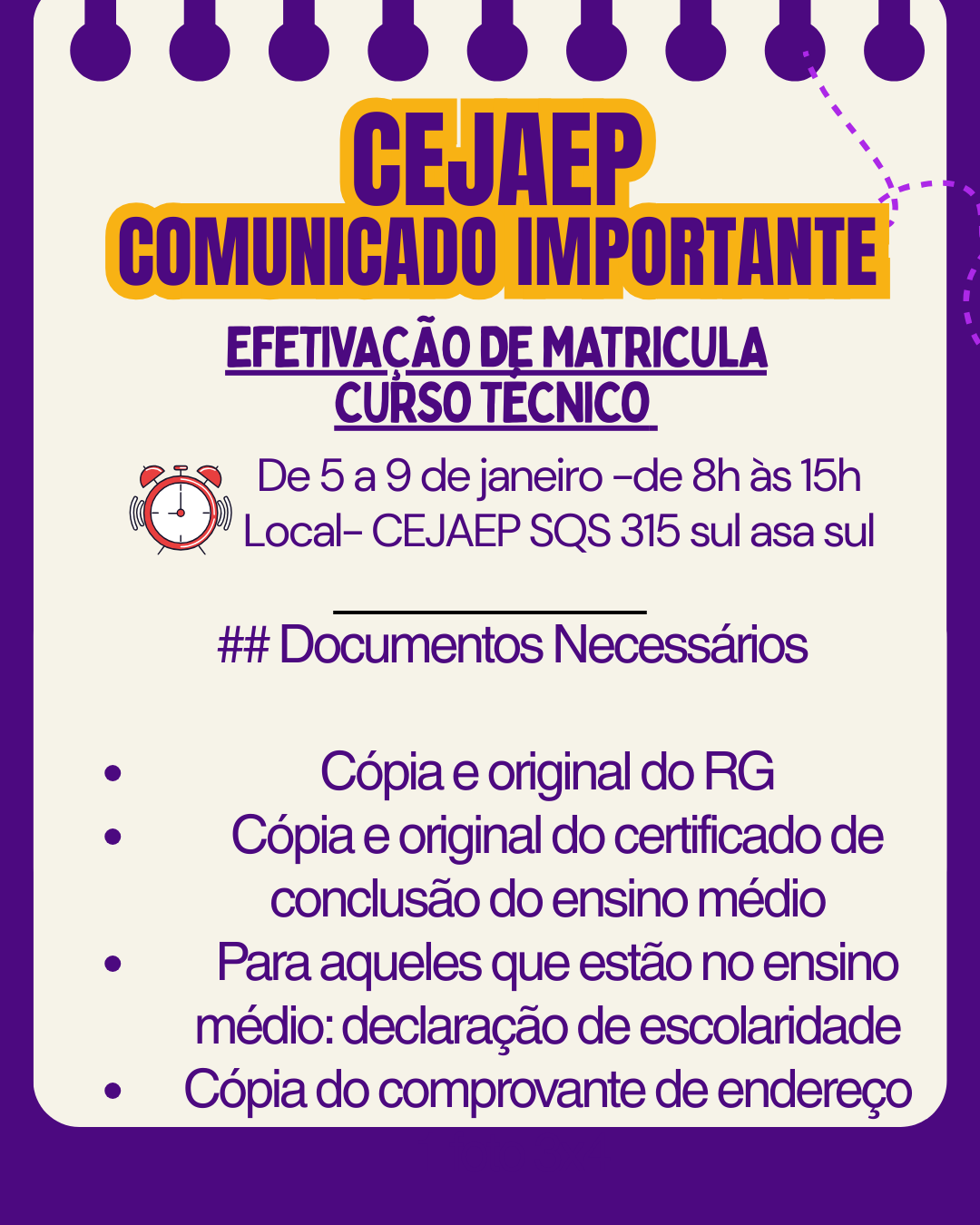Efetivação de Matrícula do Curso Técnico - 1ª Chamada - de 05 a 09 de janeiro de 2026; CEJAEP - SQS 315 SUL - Asa sul Plano Piloto - dentro da quadra residencial. Relação nominal dos contemplados 2026.1