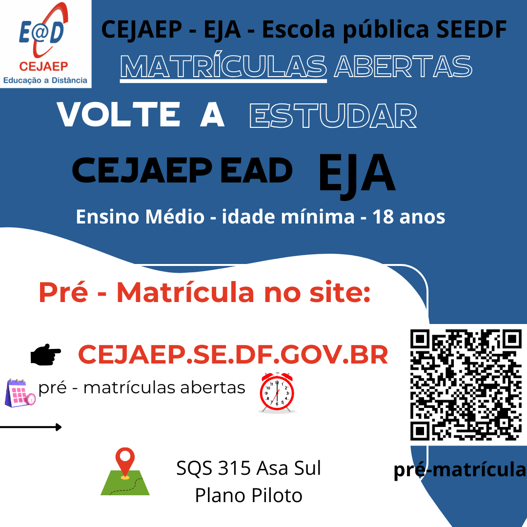 Aqui, você terá acesso à modalidade de ensino da Educação de Jovens e Adultos e da Educação Profissional. Estas ofertas são realizadas pelo CEJAEP que é vinculado à Secretaria de Estado de Educação do Distrito Federal.